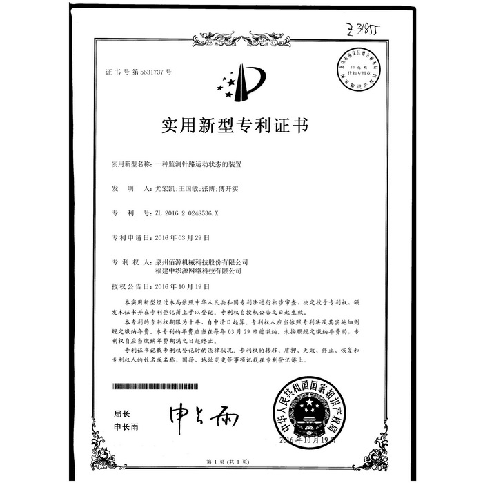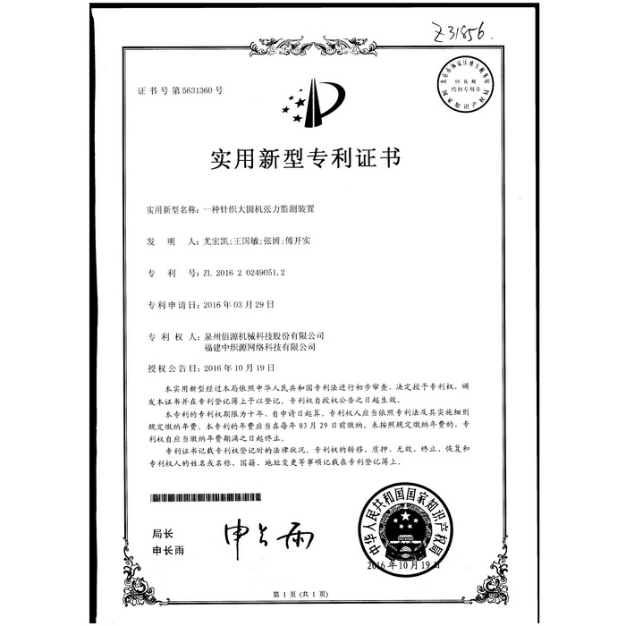 新型-泉州佰源機械科技股份有限公司 一種大圓機大盤齒輪的脈沖微調(diào)結構 實用新型專利證書